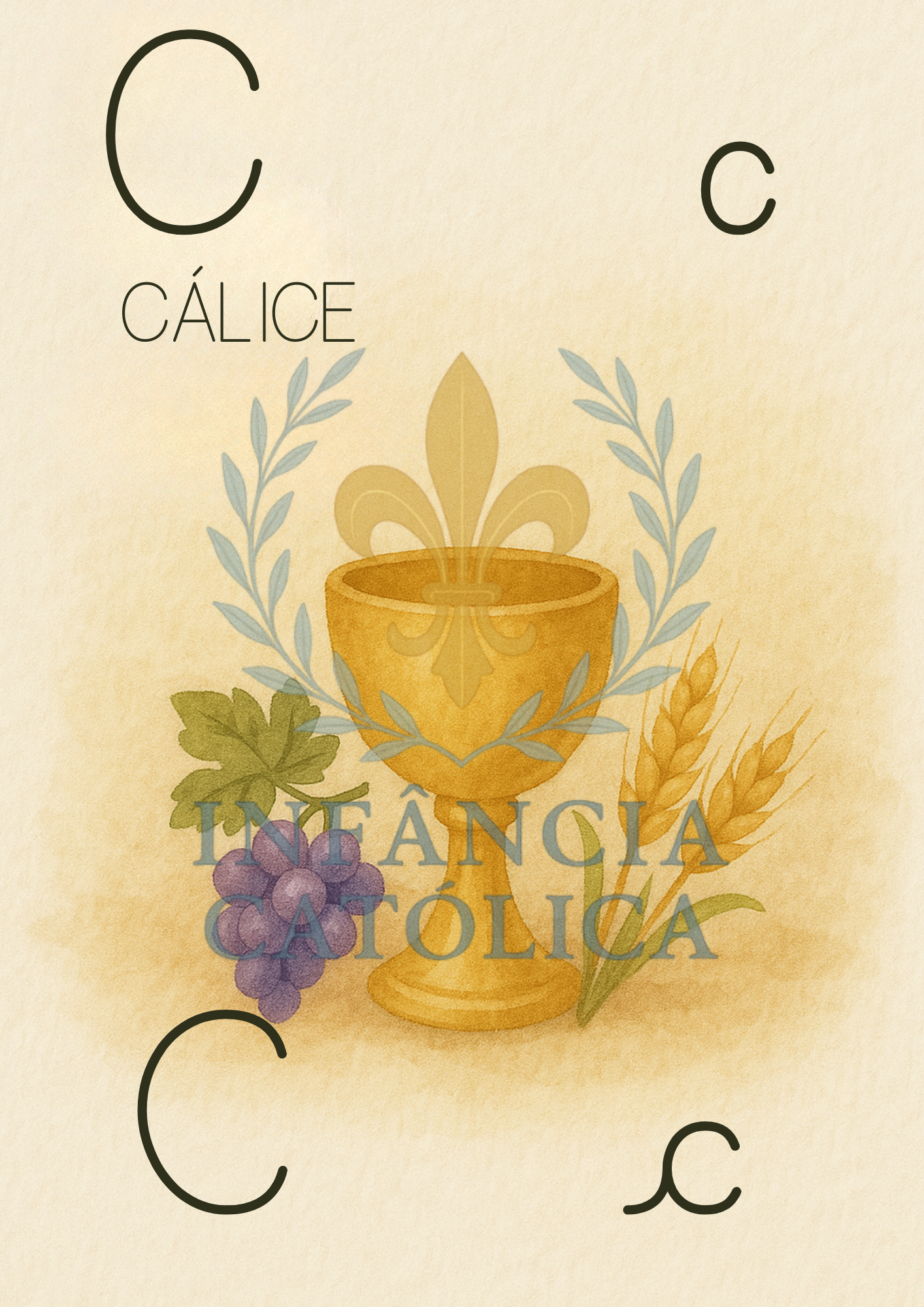 Cada letra apresenta um personagem, símbolo ou elemento da fé católica, com ilustrações encantadoras.