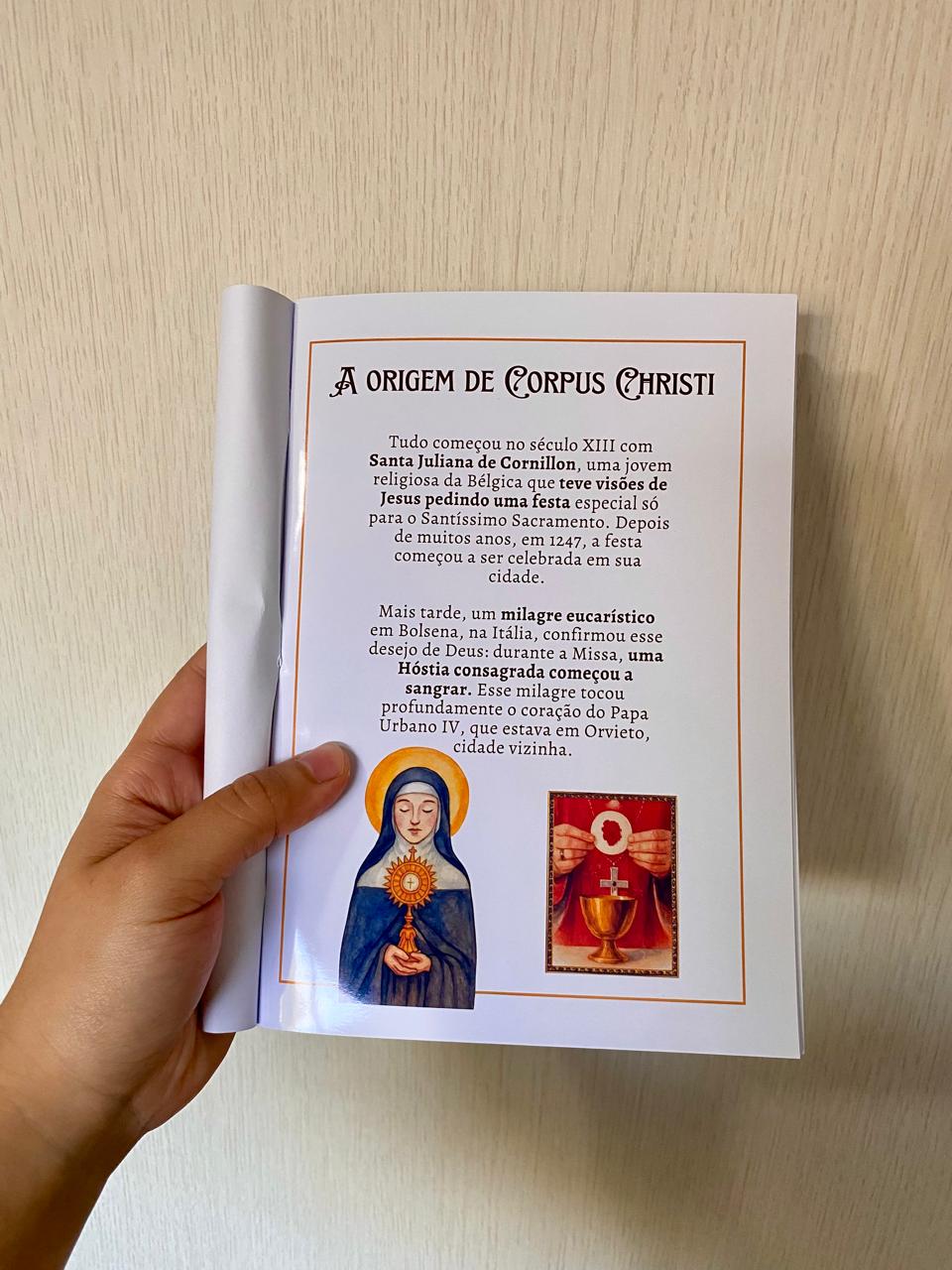 Este material catequético apresenta, com delicadeza e simplicidade, a origem da solenidade de Corpus Christi — desde as visões de Santa Juliana de Cornillon, passando pelo milagre eucarístico de Bolsena, até a instituição da festa pelo Papa Urbano IV.