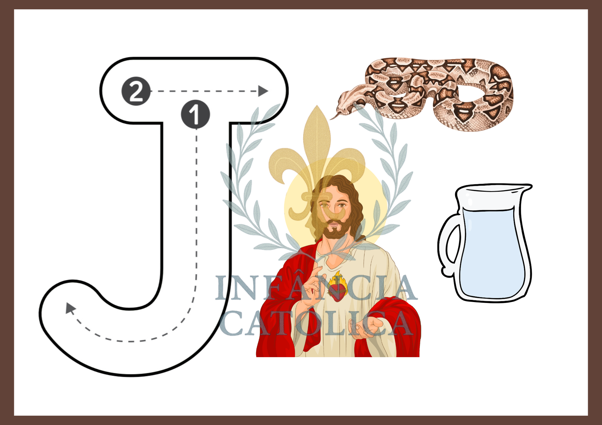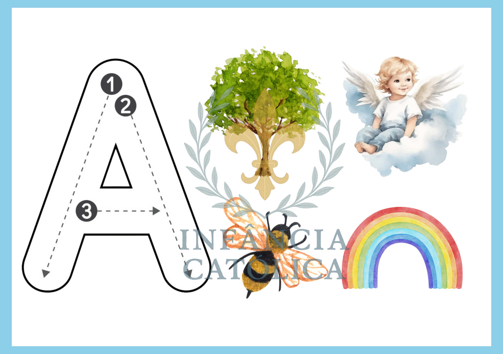 Cada letra é acompanhada por imagens do cotidiano e elementos da fé católica permitindo que o exercício manual aconteça em um ambiente visual ordenado, belo e formativo.