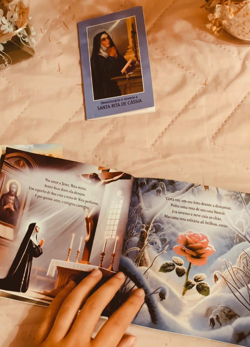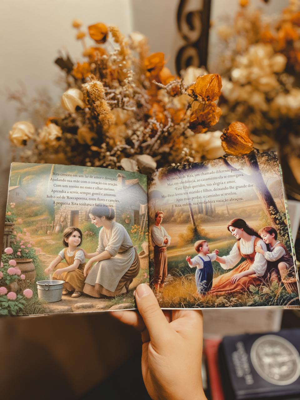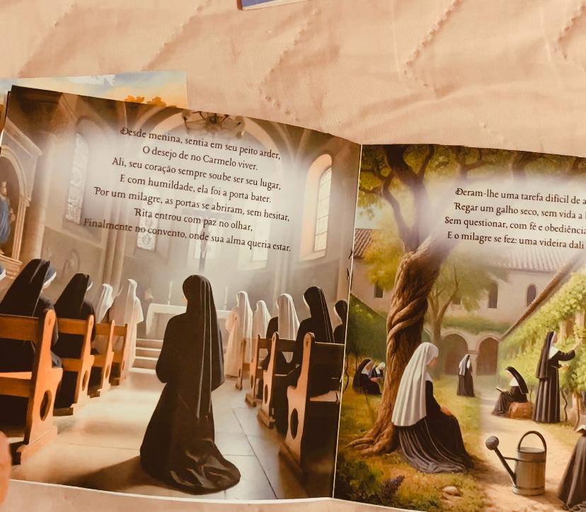 A narrativa rimada e as imagens delicadas conduzem a criança pelos principais momentos da vida de Santa Rita: sua infância piedosa, seu sofrimento no matrimônio, sua entrega a Deus no convento, o milagre da videira, o espinho da paixão de Cristo e sua confiança inabalável.